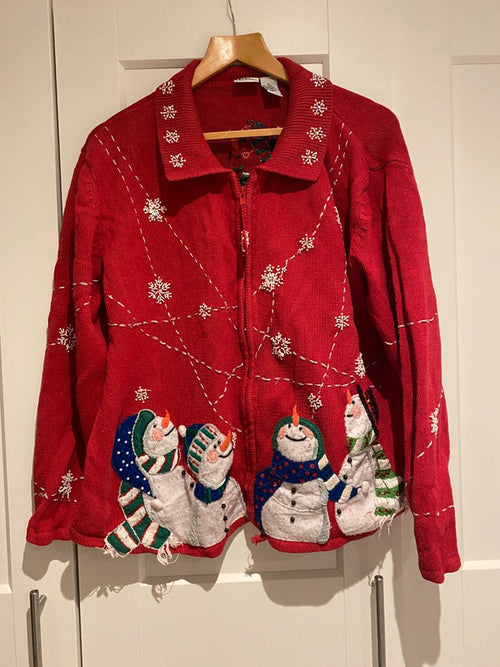 Tiara International Christmas Cardigan – Red Snowman Embroidered Sequin Sweater (Size L) -